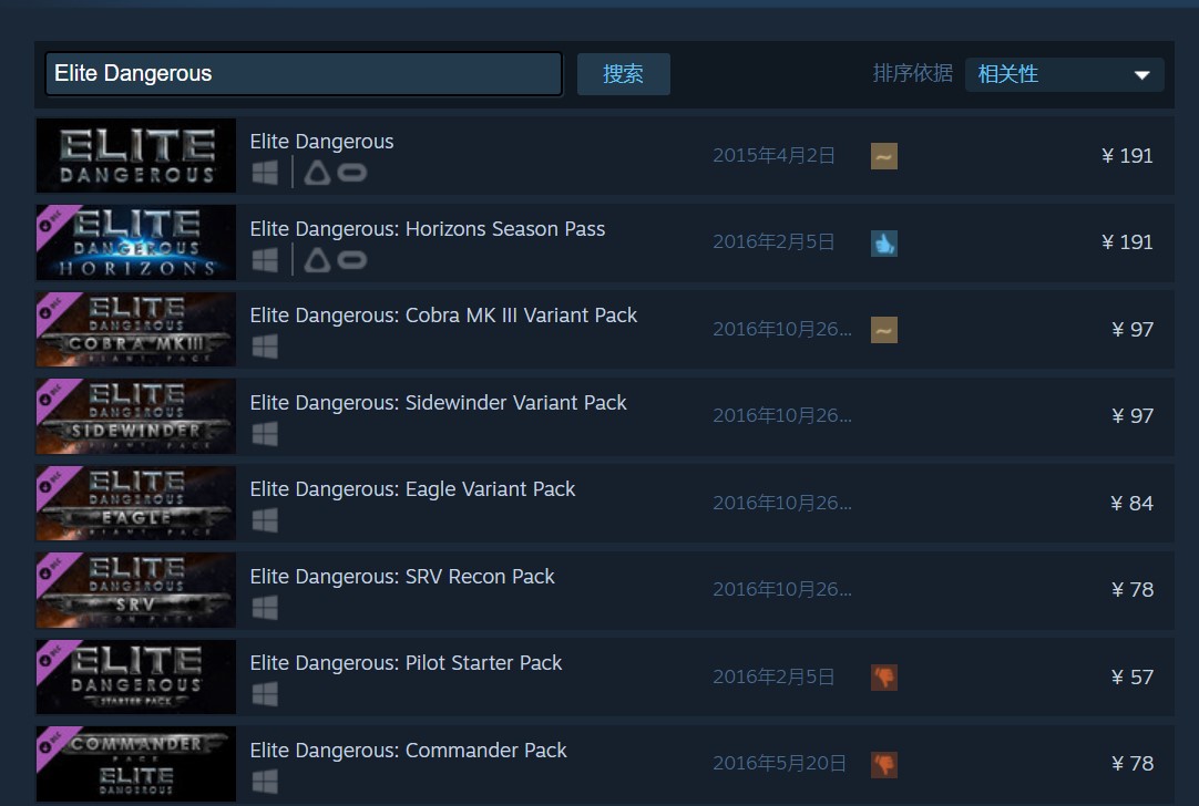 《精英:危险》2014年发售,自发售以来推出了多次更新。Steam国区本体游戏191元,不过后续的DLC还是蛮多的,而且都是收费的。
