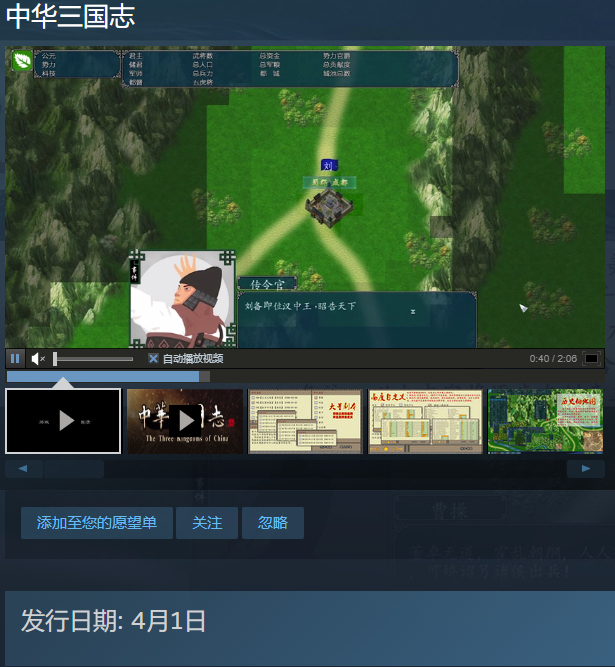 《中华三国志》是由国内民间团队开发研制的一款免费开源的单机策略三国游戏,可以在手机、平板、电脑等进行游戏。如今,历时一年准备,开发团队终于做好了上架Steam的准备。
