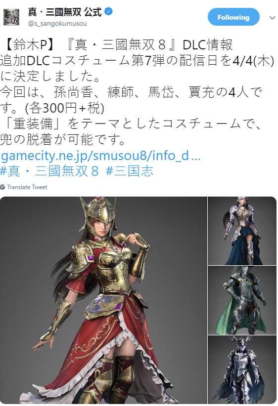 如果有一直关注《真三国无双8》这款游戏,那么你一定知道该游戏前不久推出了一款“重甲骑士”风格的服装DLC,继上次推出王元姬、貂蝉、乐进以及李典的骑士风服装后,这次光荣又追加了孙尚香、练师、马岱和贾充的骑士服装。