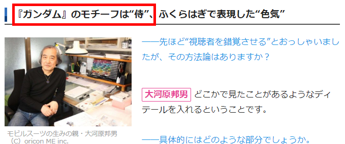 大河原邦男:在当初构思《高达》的机械设定之初,安彦良和曾经提案罗伯特・A・海因莱恩的著名SF小说《宇宙战士》中的“动力装甲”作为原型,不过最终定稿时只把这个提案设定在了《钢加农》上,我提议的《侍》原型最终得到了大家的一致认可,成就了近40年的高达系机设风格。
