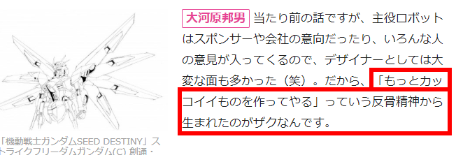 大河原邦男:话说向来主角总是规规矩矩形象端正,高达也不例外,不过我想设计更加帅爆的东西来”反逆“一下高达,于是乎一只眼的扎古就此诞生了。(然而并没有高达帅。。。)