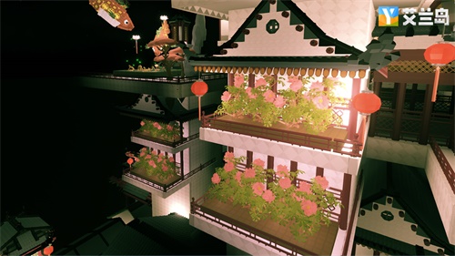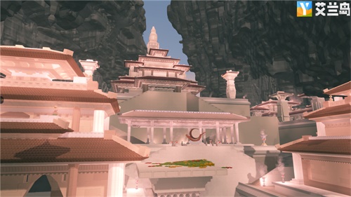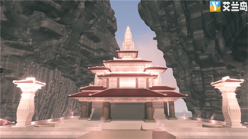 整个场景借以分形为原理建造,分形是70年前西方学说,中国早在几千年前就已经用分形完成建筑构造。整个梦中楼阁如梦似幻,集中还原出中国古式建筑的大气和精美,在颜色搭配上,深浅间接,结合光影的效果让琼楼玉宇高大巍峨。