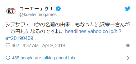 ·就在日本政府公布了预定2024开启流通替换的新版钞票设计方案后,光荣官推稍后直接宣布,其创始人襟川阳一先生后来改名SHIBUSAWA·KOU,其中的SHIBUSAWA就来自“渋沢”,而后面的KOU则来自光荣的日语发音。
