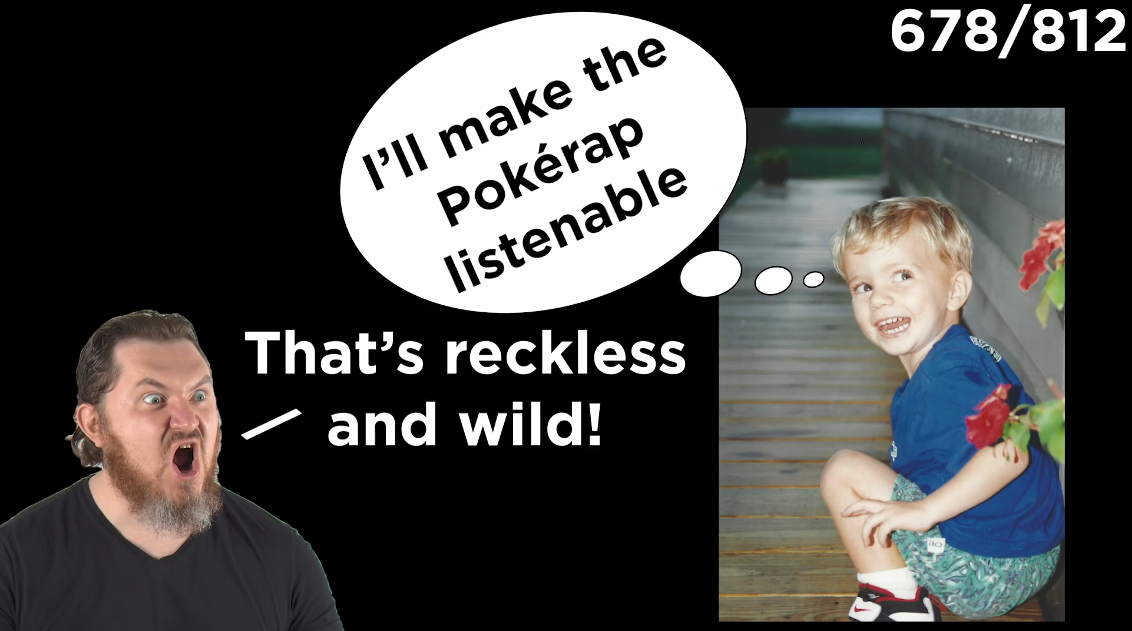《the perfect PokéRap》整首歌长达9分钟,Brian David Gilbert还在歌词中表示,从小时候开始,他就有把宝可梦名字做成一首歌的想法,尽管当时没什么人支持他,但他并没有放弃,每天坚持为之努力(有着皮卡丘的陪伴),时至今日,终于达成所愿,可见是个真爱粉了。