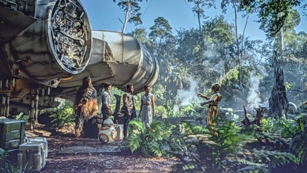 这里第一张是一副概念画,画中蕾伊和朋友们在一颗密林星球着陆。这个场景和预告片里他们发现死星2号的场景一致。