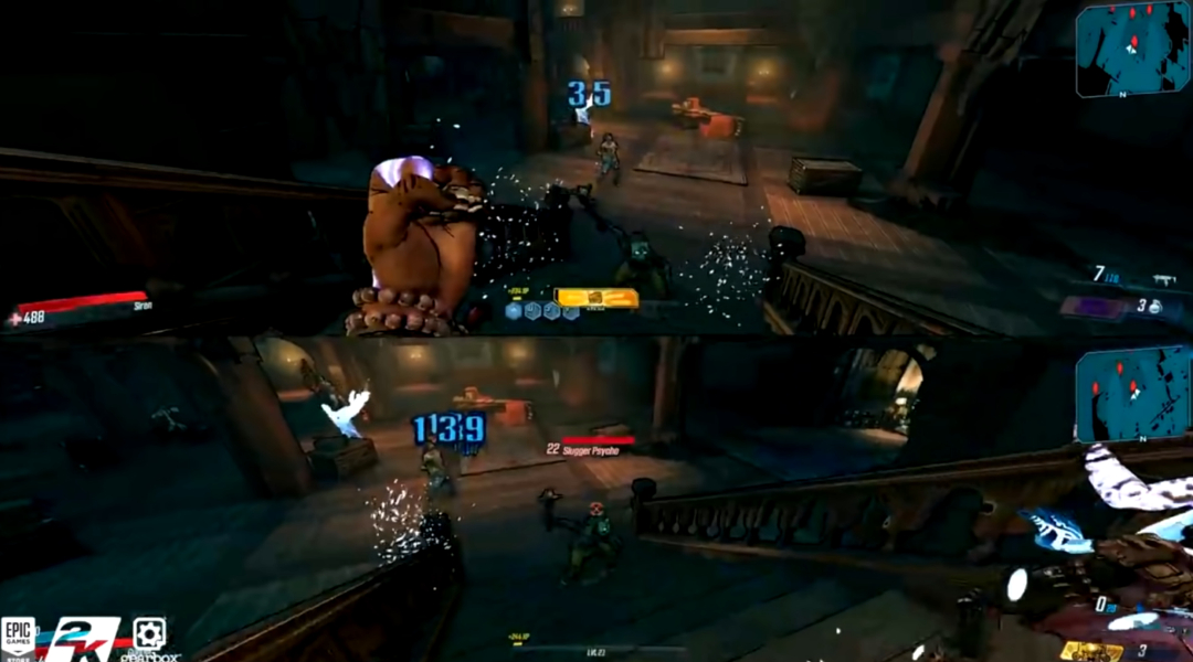 在视频画面中,包含了游戏角色Amara和Moze在分屏合作模式下的作战场景。《无主之地》系列玩家首先看到的是自己非常熟悉的UI元素,血量和护盾在画面左侧显示,Amara的被动技能“杀戮技巧”在画面中央显示,弹药、手雷和大招在画面右侧显示。