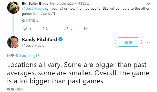“各个地点都有所不同,有的地方比之前的平均大小要大,有的地方更小,总的来说,《无主之地3》的地图比之前的游戏都要大得多。”