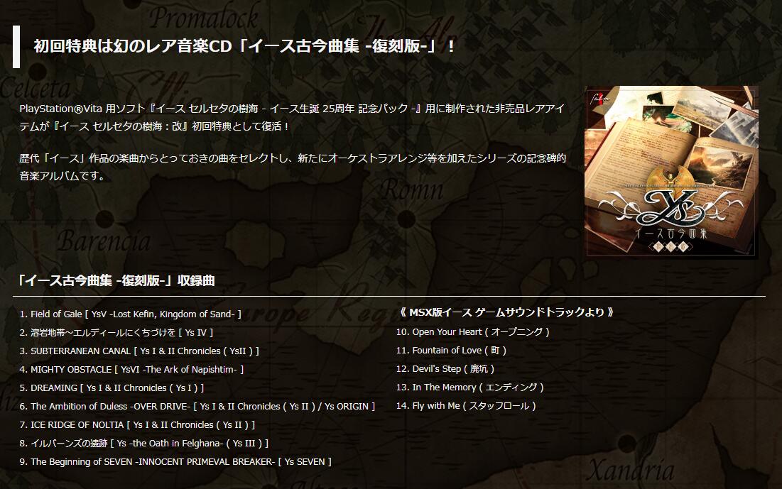 《伊苏塞尔塞塔的树海》是《伊苏8》、《伊苏9》的原点作品,是《伊苏4 太阳假面》的重制作品,已于2012年登陆PSVita平台。本作售价4298日元(税后约合264人民币),加入了自动生成地图、极限回避等全新系统,对应60fps、1080p高清画质、BGM高音质化等大幅提升。并且首批购买本作的玩家将能够获得初回特典《伊苏 古今曲集 复刻版》。