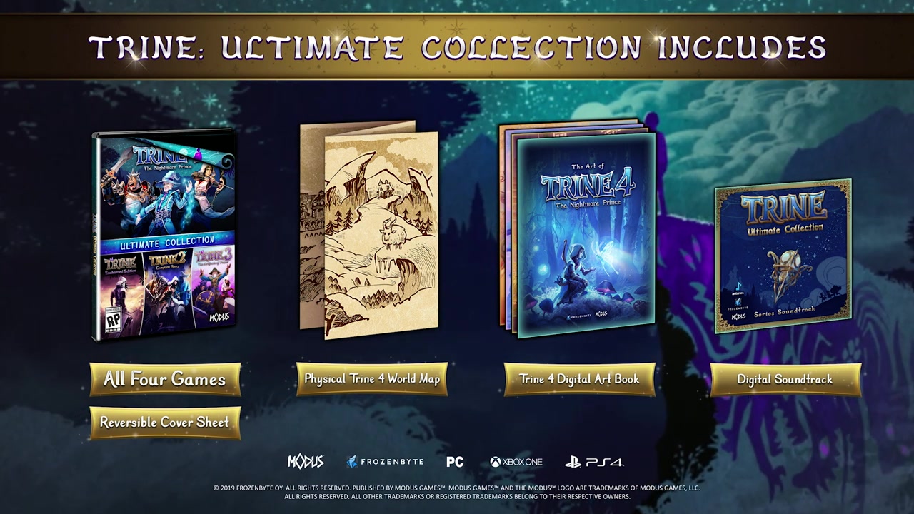 与其他的合集/收藏版游戏不同,这次的《三位一体:终极合集》除了包含之前已经推出的前三作《三位一体》外,还将包含尚未推出的新作《魔幻三杰4:噩梦王子》,之前的三作分别是:《三位一体增强版》《三位一体2:完整版》《三位一体3:权力的神器》。《三位一体:终极合集》预计将于今年秋季登陆PS4/XboxOne/PC。