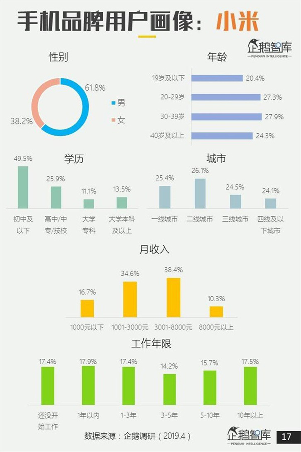 而小米用户则集中在一二线城市,合计占比超过总用户数的50%,说明小米对于三四线城市的渗透力度还有待提高;小米用户中男性比例接近2/3,大大高于女性。