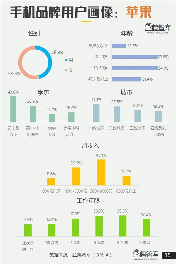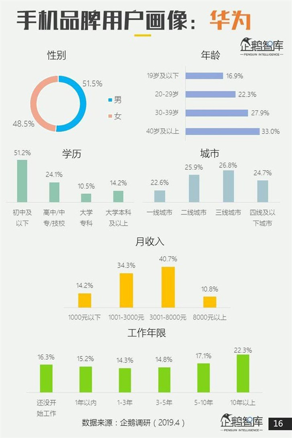5、一二线城市用户选苹果/小米,中老年人选华为,三四线城市偏爱VIVO/OPPO