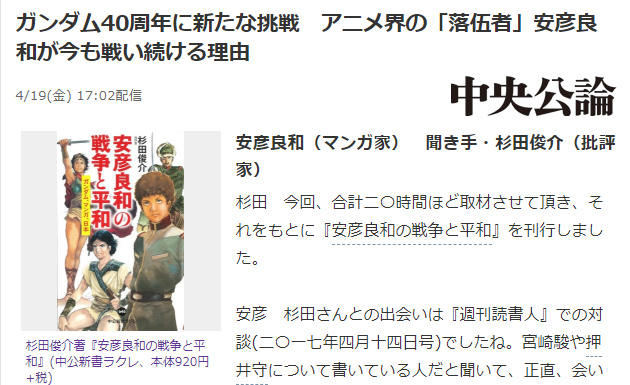 ·安彦良和自嘲自己为“落伍者”,因为自己的多部漫画根本不受欢迎卖不动,或许是由于多是和“战争与和平”主题有关的缘故,不过卖的最好的唯有一部《机动战士高达:THE ORIGIN》,而安彦良和更是苦笑称原本以为《机动战士高达:THE ORIGIN》畅销会带来连带效应拯救一下自己其他作品的销量,谁知根本没起到一点作用。