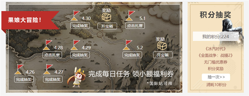除了各种花钱才能赚到的优惠,杉果春促也为玩家准备了动动手指就能领的优惠。玩家可以在杉果春促活动页上找到积分抽奖活动,消耗10积分抽奖即有机会赢取《全面战争:战锤2》《冰汽时代》等好评游戏或是无门槛优惠券。每日完成积分抽奖或签到等日常任务,还可以在指定奖励日领取额外福利。每天在杉果查看完限时折扣后,再动动手指参加活动即可。