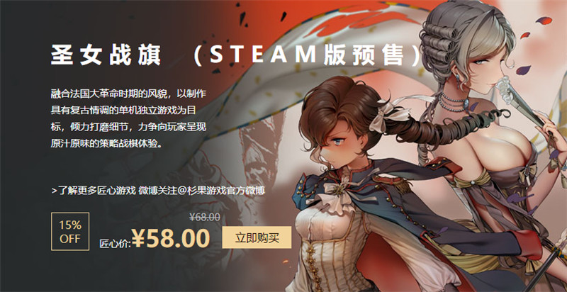此外,由杉果运营方中电博亚发行的SRPG《圣女战旗》现在已经开始预售,游戏5月28日登陆Steam平台前抢先通过杉果购入Steam版只需58元。
