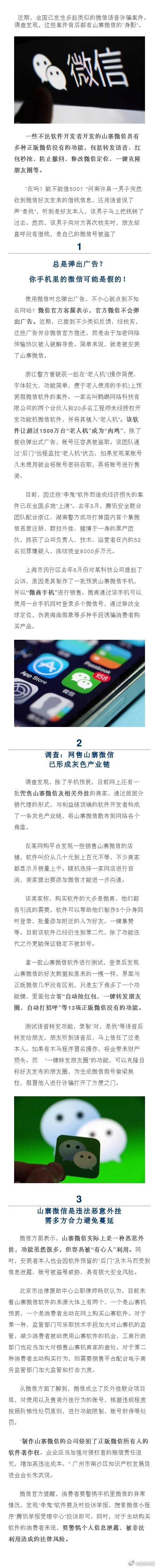 2.网售山寨微信已形成灰色产业链,多包含“自动抢红包”、“一键打招呼”、“一键克隆朋友圈”等官方微信不具有的功能;