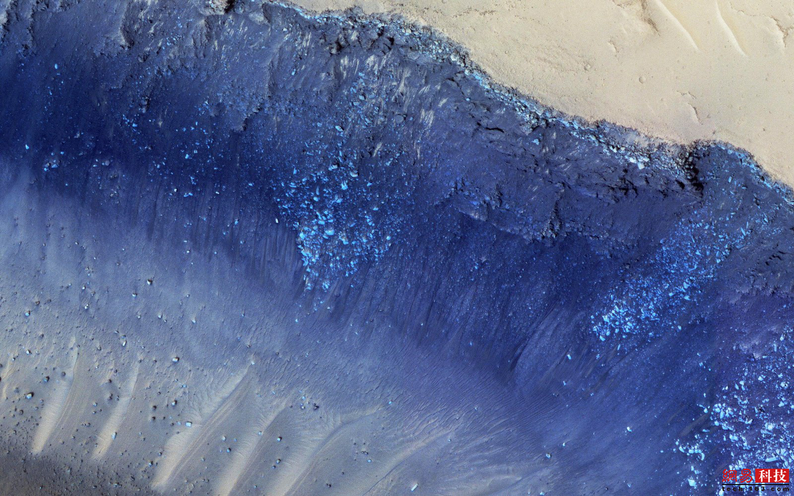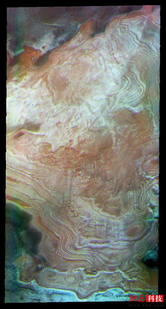 火星上的冰既有水冰,又有干冰,这让火星地表出现了一些有趣的图案。奥德赛号火星探测器捕捉到了这张极地冰帽呈漩涡状的照片。红色、橙色和白色构成冰盖,而紫色和绿色则是其他物质(很可能是泥土和岩石)。这种水冰和干冰的特殊混合物需要数百万年的时间才能形成。但是,就像在地球上一样,较温暖的火星季节里,一些冰帽会融化,然后重组。