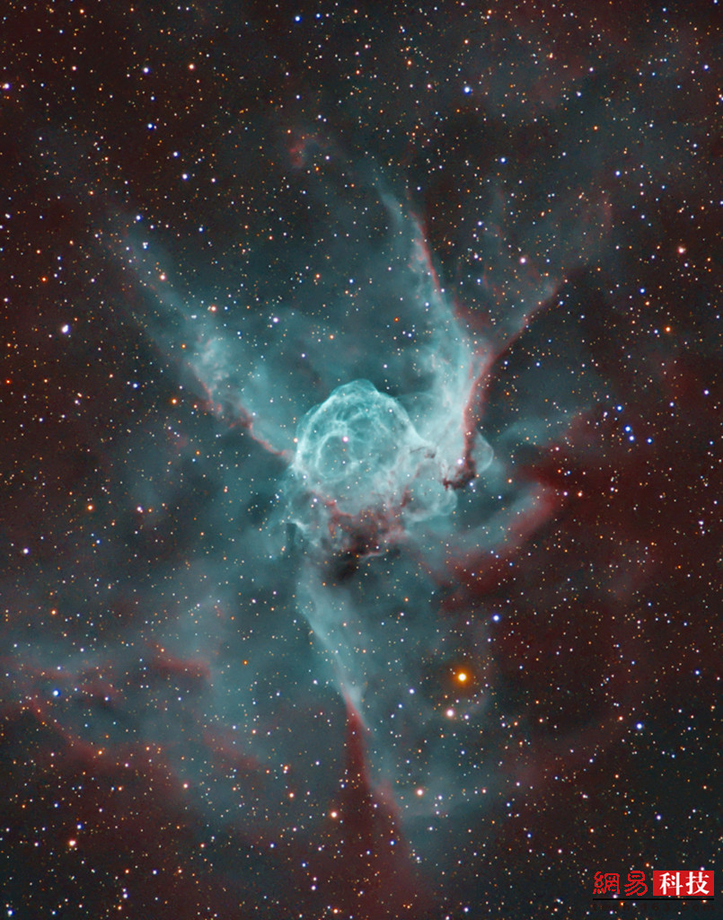 NGC 2359是一片头盔形状的宇宙云团,两侧呈现翅膀状,因此常被称为雷神头盔。这个“头盔”直径约30光年,它也像是个星际气泡,气泡中心附近明亮的大质量恒星吹着疾风使这片区域持续膨胀。这颗中央恒星被称为沃尔夫-拉耶特恒星,是一颗极热的巨星,处于超新星爆发前的短暂演化阶段。