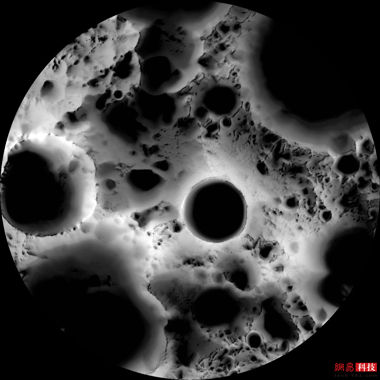 NASA希望研究月球上拥有可利用资源的地方。主要探查地点之一是南极,那里的水冰隐藏在陨石坑阴影中。这张由NASA月球勘测轨道飞行器拍摄的黑白照片展现了沙克尔顿陨石坑(图中心)。它是月球南部几个永久处于阴影中的陨石坑之一,很可能含有大量的水冰。