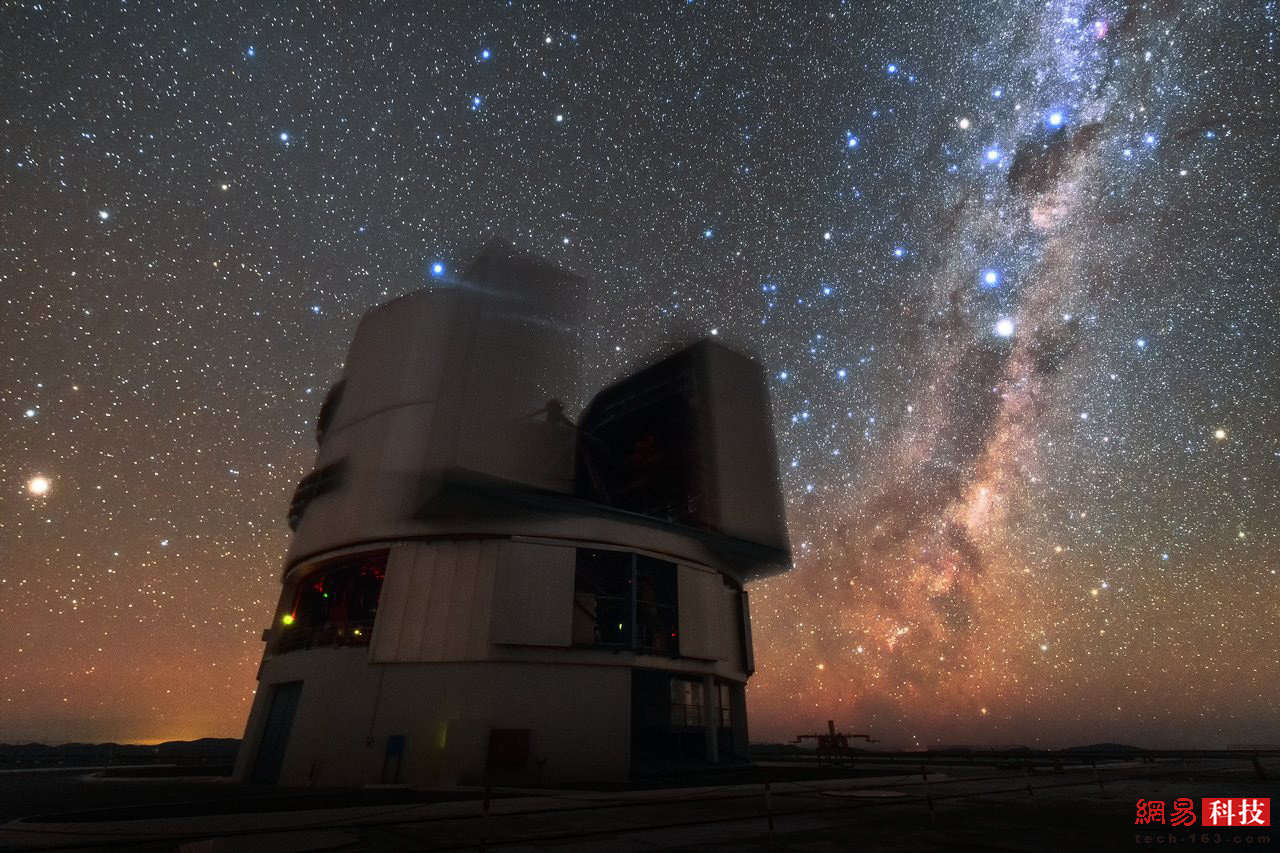 这是甚大望远镜的四大组件望远镜之一,银河系如同它的手臂一般在夜空中伸展。每台望远镜都拥有直径为8.2米的主镜,这使它们成为世界上最大的单镜望远镜之一。如果把四台望远镜结合使用,观测精度比单镜使用时要高出16倍。帕拉纳尔每年大约出现300个晴朗的夜晚,绝佳的观赏条件使之成为充分发挥甚大望远镜性能的最佳地点。