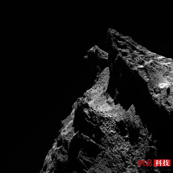 罗塞塔号从500万公里的距离逐渐飞近彗星67P,并从各个角度记录这颗彗星的形态。从远处看,彗星的形状往往像只鸭子。但这张照片却很有意思,它就像一只猫的侧脸。彗星上的某处双峰像极了两只猫耳。这张照片拍摄时距离彗星18.6公里。这只是罗塞塔号拍摄的近7万张照片之一。
