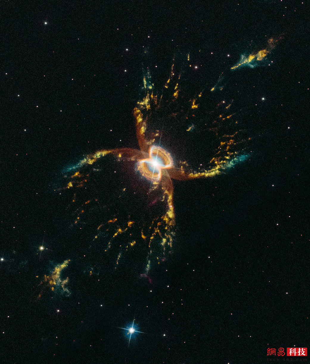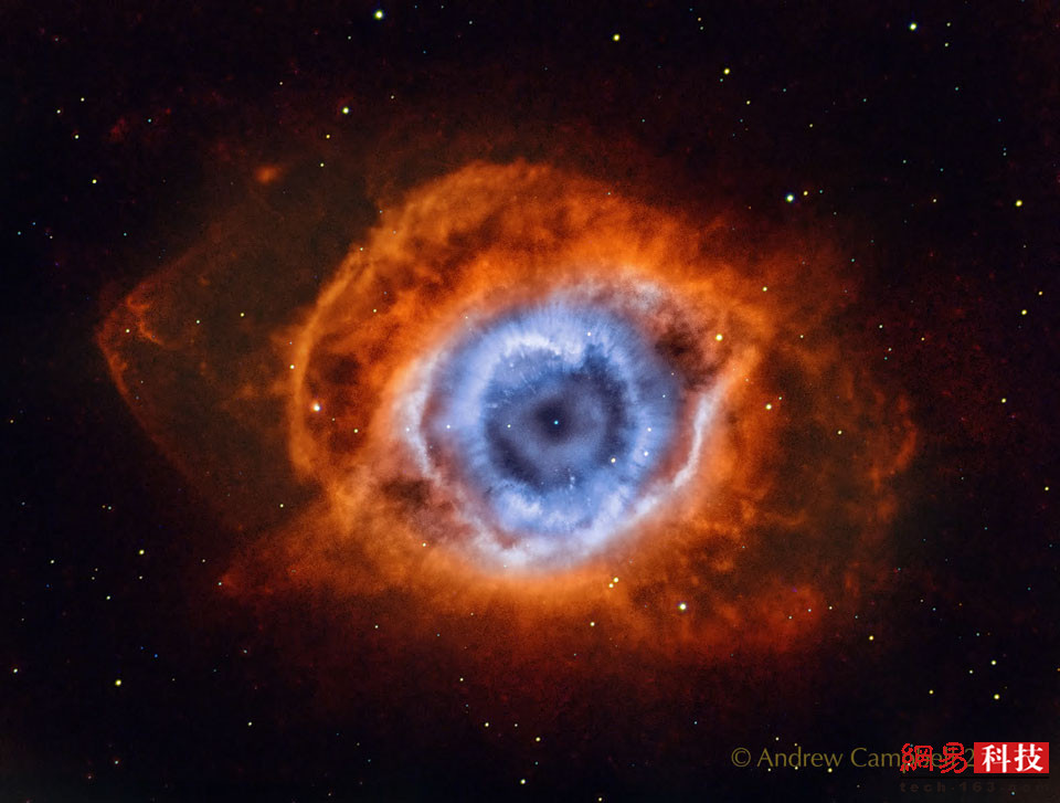 太空中一只巨眼在盯着我们?螺旋星云(Helix Nebula)拥有复杂得惊人的几何结构,如径向细丝和扩散而出的外环。它是最明亮和最接近地球的行星状星云之一,这类星云是在类太阳恒星生命末期形成的气体云。中央残留的恒星核心将成为一颗白矮星,它发出的光具有很高的能量,令先前被排出的气体发出荧光。