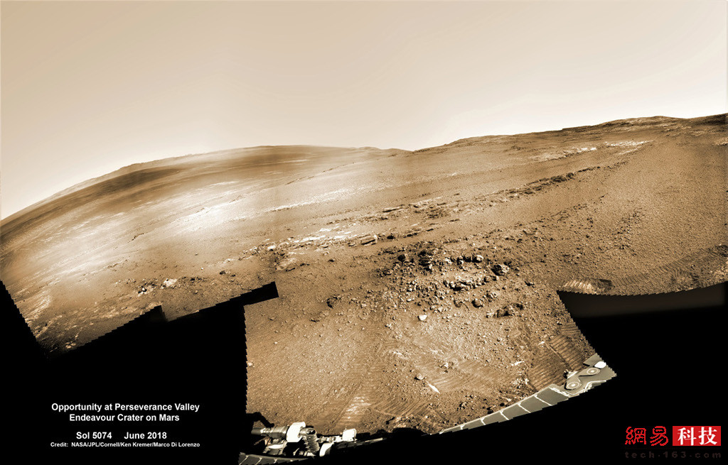 这里就是机遇号超过45公里的火星旅程的终点。这张图由机遇号导航摄像头拍摄的彩图拼接而成。它在火星上探索近15年,2018年6月因大规模沙尘暴而在毅力谷陷入了休眠。此后数月NASA与之取得联系的尝试屡屡失败,“机遇号”的开拓性任务因此宣告结束。