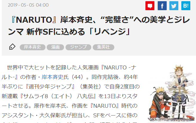 带给读者无数感动的《火影忍者》终于还是先于同门大师兄《海贼王》完结了,5月5日今天外媒发表了对即将开启新连载《武士8》的原作者岸本齐史的访谈,一起了解下岸本齐史旧作逝去,新作再袭的心路历程。