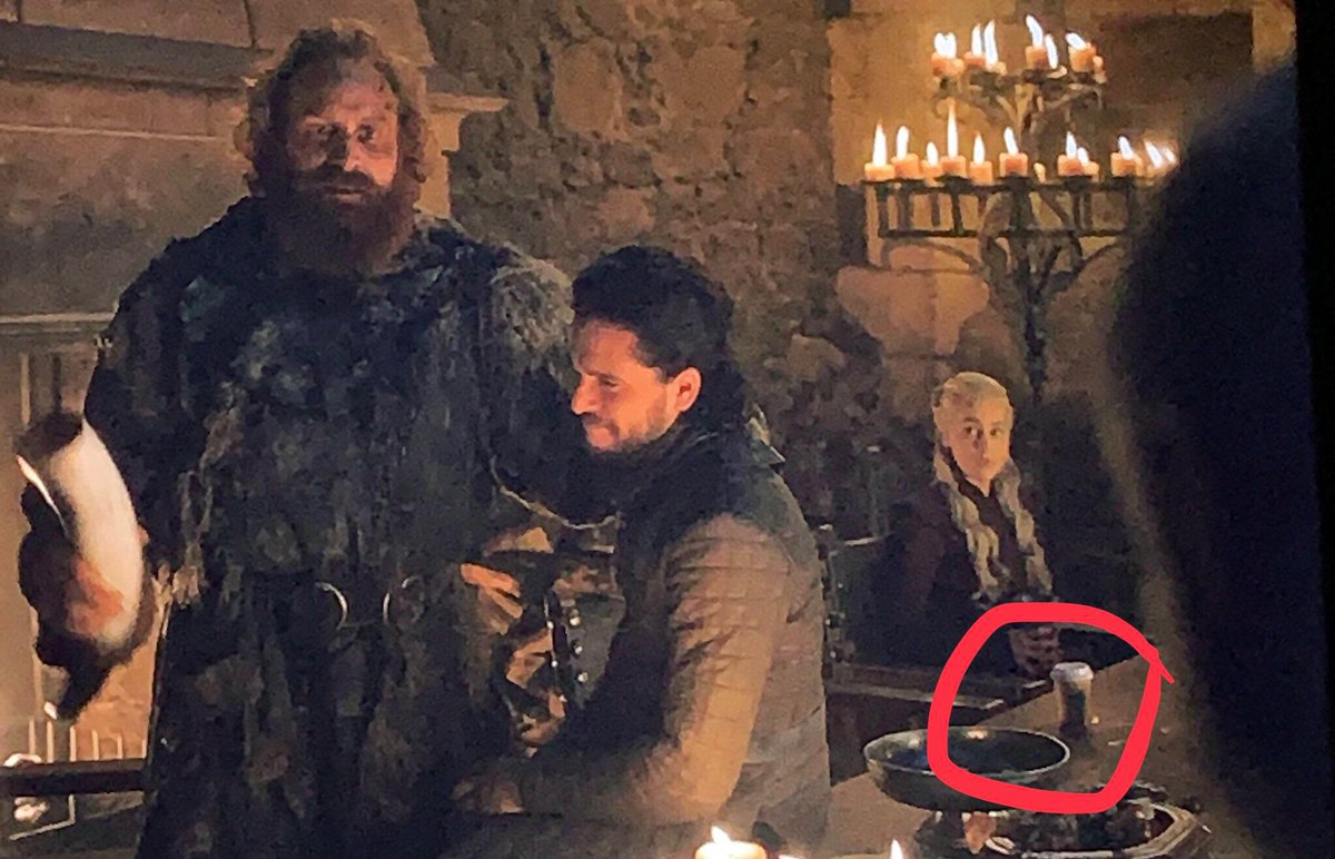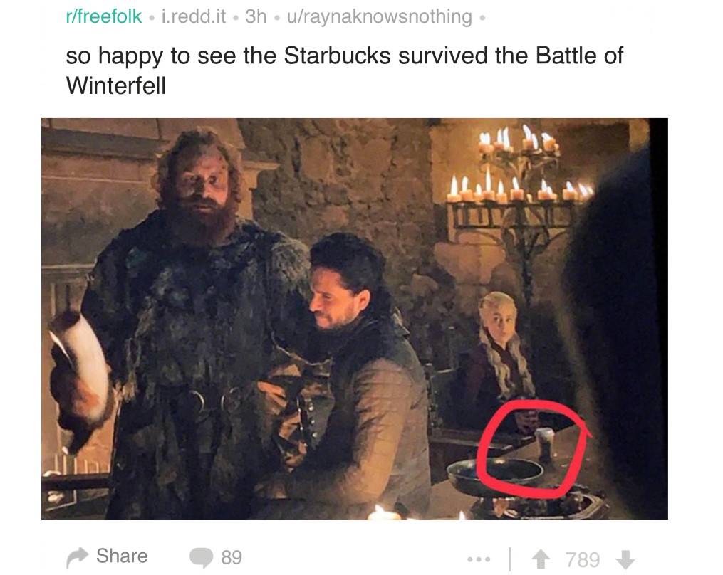 如上图,可以看到桌子上有一杯星巴克咖啡,国外网友调侃称“很高兴看到星巴克竟然从临冬城之战中活了下来”。目前尚不清楚这是星巴克的广告,还是剧组的纯属失误,忘了在拍摄时拿走这杯取暖用的咖啡。
