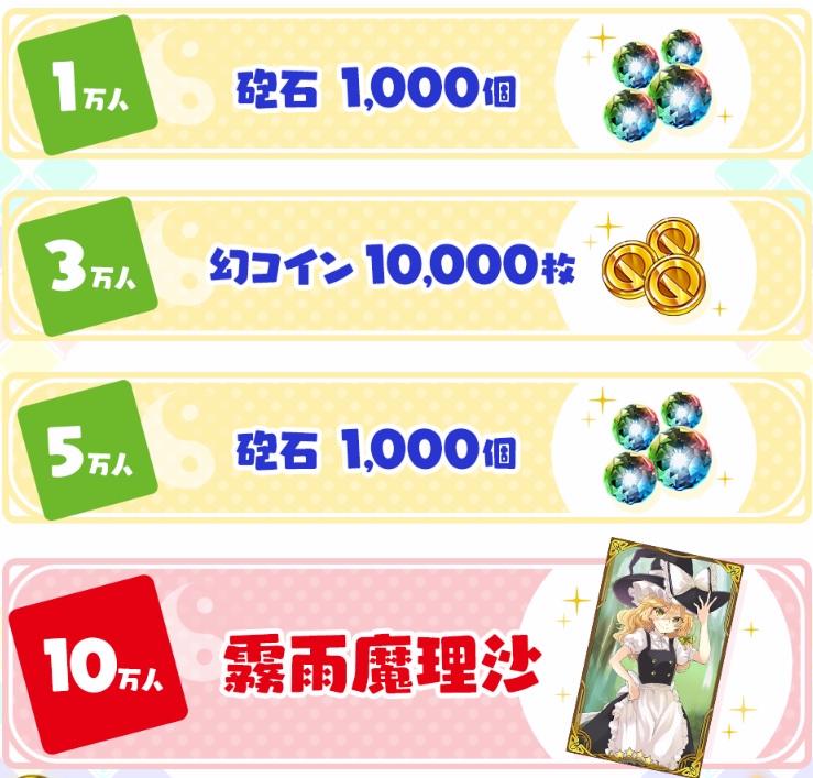 事前登录方面,玩家们可以按事前登录人数获得不同的游戏奖励,包括游戏中课币与炮石等,突破 10 万人更可以获得角色「雾雨魔理沙」,东方的粉丝们不要错过了!