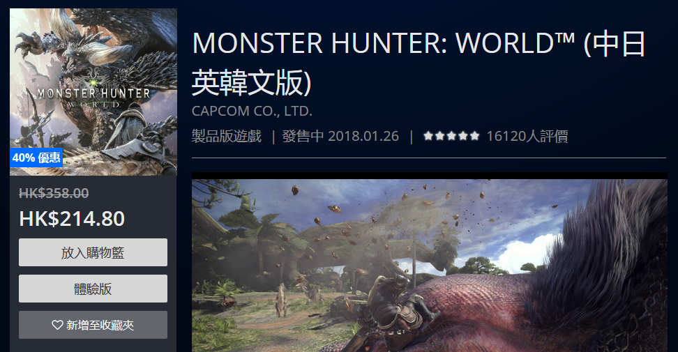 本次折扣面向所有地区的用户,比如支持简繁中文字幕的港服PS商店原价358元,现价214.80元,折扣力度还是比较大的。值得一提的是特价促销从今天开始,持续到5月31日,另外,PS商店还提供了《怪物猎人:世界》的免费试玩版可供下载,试玩版游戏进度可以保留到正式版当中。