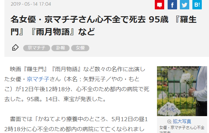 战后日本电影获得国际奖最多的女演员、曾经主演黑泽明导演史诗名作《罗生门》的日本演员京町子于5月12日因心脏病去世,享年95岁。东宝影业5月14日今天公开了这则消息。