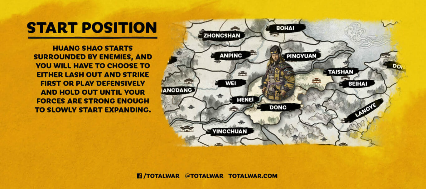 黄邵开始就会被敌人包围,其中最著名的是孔蓉、刘备和袁绍,玩家必须选择先谴责并先发动攻击,还是进行防守直到你的力量足够强大,然后再慢慢开始扩张。然而,由于黄邵的领土被黄河分割,防御很困难,保卫西岸将需要大量的军事投资。