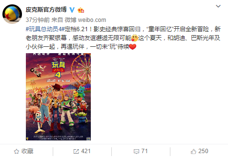 今天(5月21日),《玩具总动员4》发布中文海报,国内档期确定,将同步北美于6月21日在影院上映,而上一部《玩具总动员》上映距今已经有将近9年的时光了。
