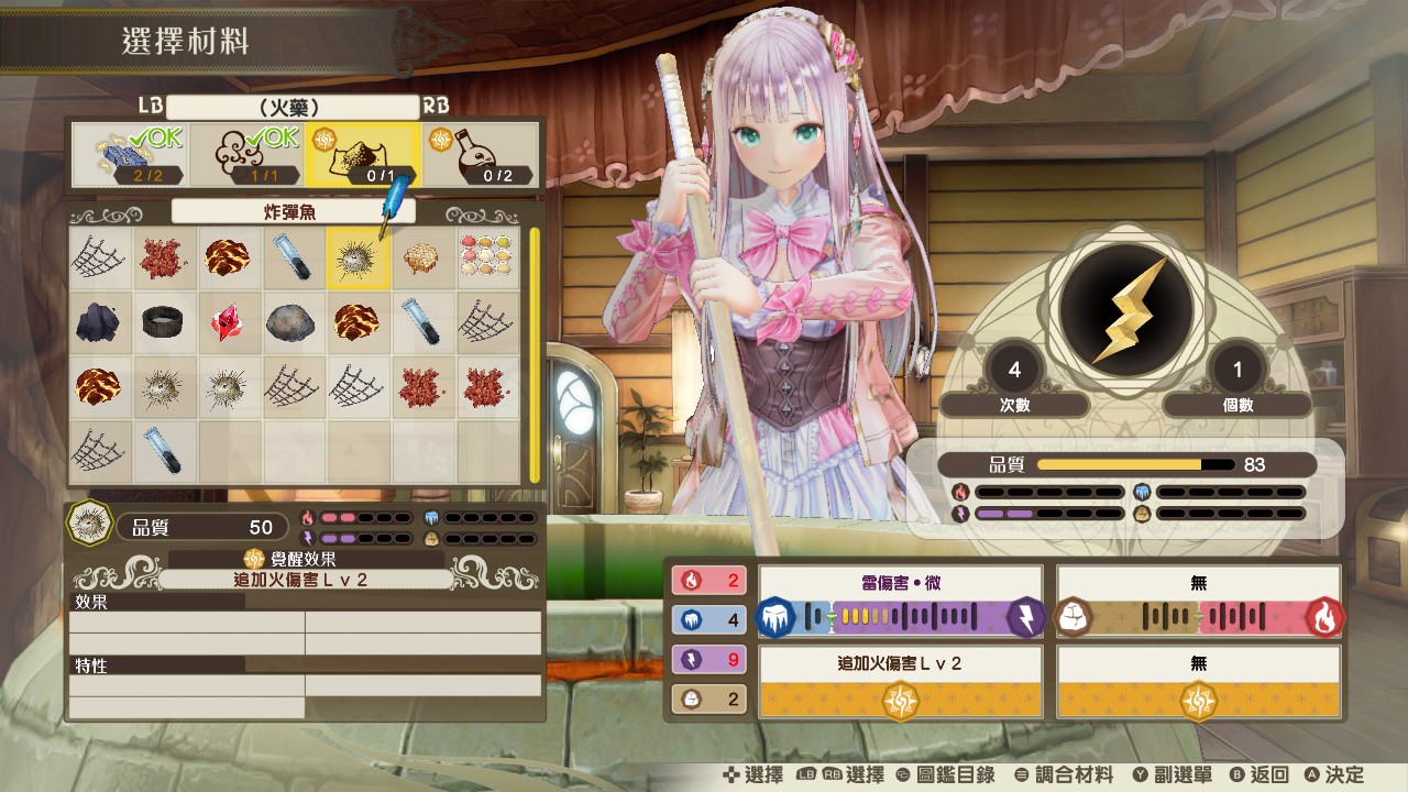材料除“品质”与“特性”等要素之外,还有冰与土等“錬金成分”。要如何提升4种錬金成分,也会影响完成的道具的威力与效果。