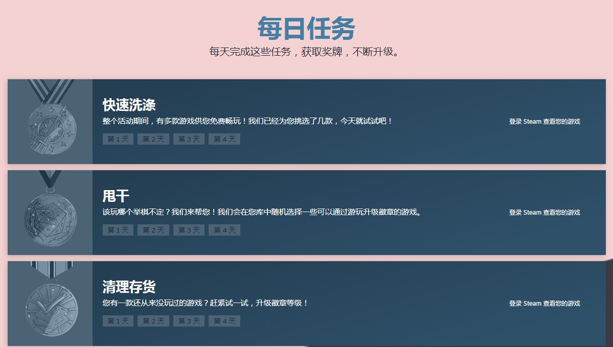 整理库中旧游戏,发掘新游戏!完成下列每日任务或项目,获取Steam个人资料新徽章。每日任务天天更新,但项目只需完成一次。获取五个奖杯以解锁独一无二的个人资料徽章。完成更多任务,解锁更多奖杯,不断升级。