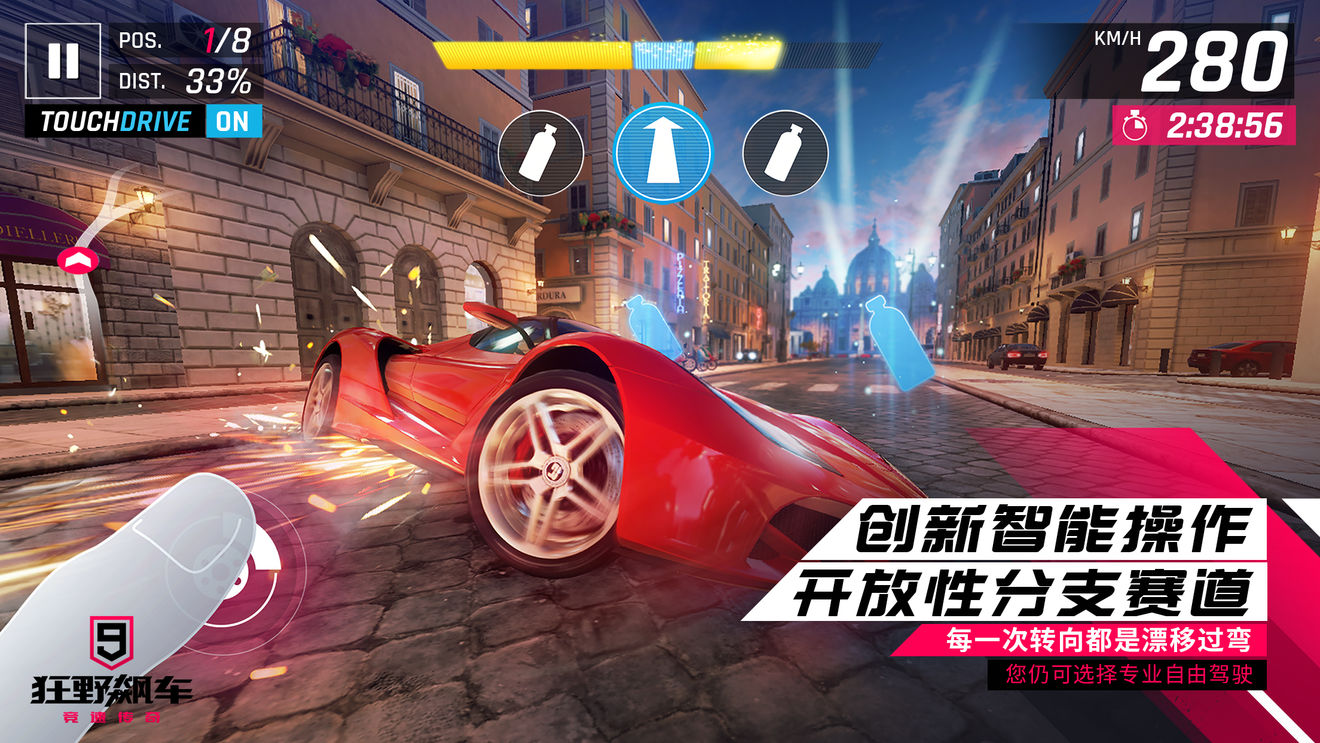 全新TOUCH DRIVE操作将帮你简化转向操作,让你专注于竞速的快感!但你也可以切换到手动控制(重力感应或点击转向),成为更专业的《狂野飙车》赛车手!