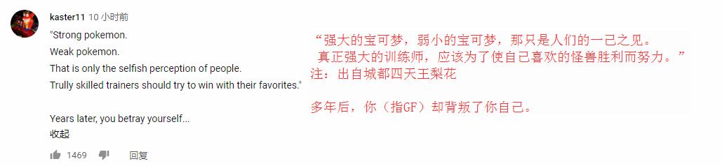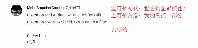 这很好的反应了玩家粉丝们对GF的不满和愤怒。系列粉丝都知道,美版《精灵宝可梦》有一句名台词,作为主宣传标语的一部分,那就是“Gotta Catch’em All(要把它们都抓住!)”,而对于如今没有全国图鉴的《精灵宝可梦:剑/盾》来说,这句话显得讽刺意味十足。