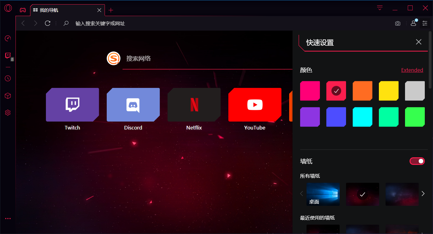打开 Opera GX 第一眼,它的外观就与一般的浏览器不同。界面采用红黑配色,整体风格很酷炫。在右上角的快速设置中,你可以调整主题颜色,浏览器中的图标、线条会随之变化。系统推荐的几个基本颜色都明亮显眼,你还可以在调色板中进行自定义调整。
