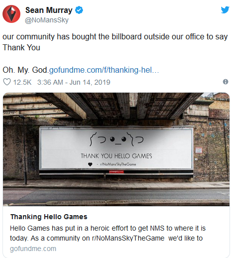 从此次展示的图片来看,粉丝们在公告板上写上了感谢的话语,这款公告板已经被挂在开发商Hello Games办公室的外侧。这些玩家在GoFundMe网站上参与了众筹活动,目标金额为1750美元,而实际众筹金额在一天之内就已经达到了2593美元。