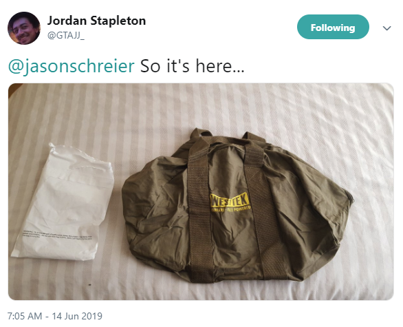 目前一部分收到补发的帆布包的玩家,在推特晒出照片,不过都表现的有些难以言尽。毕竟事儿都过去大半年,游戏还在修修补补,周边除去收藏版,另一个周边朗姆酒瓶的事却也没了下文。