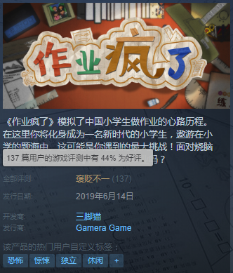 近些日子以来引发了不小话题度的国产游戏《作业疯了》于昨日(6月14日)正式登陆发行,然而从目前玩家们的反馈来看,这款游戏的表现着实让人有些失望,目前该作在 Steam 上遭遇诸多差评,好评率仅为44%。