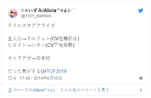 万代南梦宫在传说祭2019上公开了传说系列新作《破晓传说》男女主更多情报,男主人公名为“アルフェン(阿尔芬)”,CV 为佐藤拓也,女主名为“シオン(紫苑)”,CV 为下地紫野,本作人设由岩本稔担当。