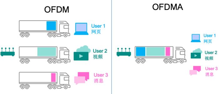 相较Wi-Fi 5的OFDM方案是按订单发车,不管货物大小,来一单发一趟,哪怕是一小件货物,也发一辆车,这就导致车厢经常是空荡荡的,效率低下,浪费了资源。OFDMA方案则会将多个订单聚合起来,尽量让卡车满载上路,使得运输效率大大提升。