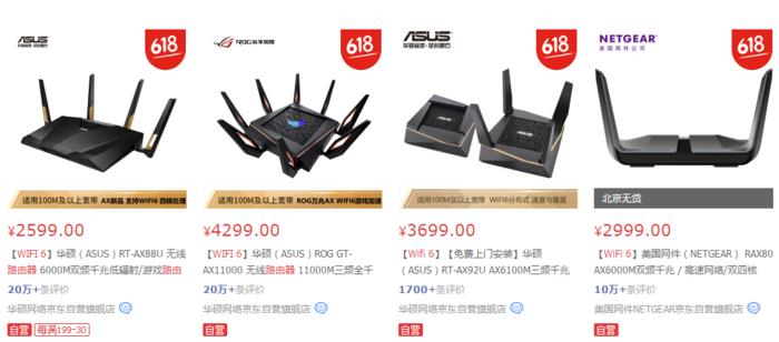 目前,已经有华硕、网件等厂商推出了支持Wi-Fi6无线标准的旗舰级无线路由器。例如华硕这款售价2599的RT-AX88U,就支持最新的Wi-Fi6标准(802.11ax)。其中,2.4G速率高达1148Mbps,5G速率高达4804Mbps,双频无线并发速率更是高达6000Mbps。不仅外观看上去科技感十足,还为用户提供了2个USB3.0接口,1千兆WAN口,8个千兆LAN口。