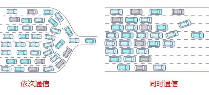 这么说可能有点抽象,我们用交通打个比方,就意味着道路由4车道单向扩充为8车道双向,同时多个设备也不再像许多车辆排队等待从一个出口驶出那样,它们可以从不同的道路同时、高效地驶出/驶入,而不再是依次排队行驶,大大提高效率。