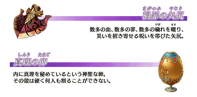 伴随着这次第二部第四章的开放,也追加了全新登场的从者们的灵基再临和技能强化所需的「罪祸的箭头」和「真理之蛋」两样全新道具。