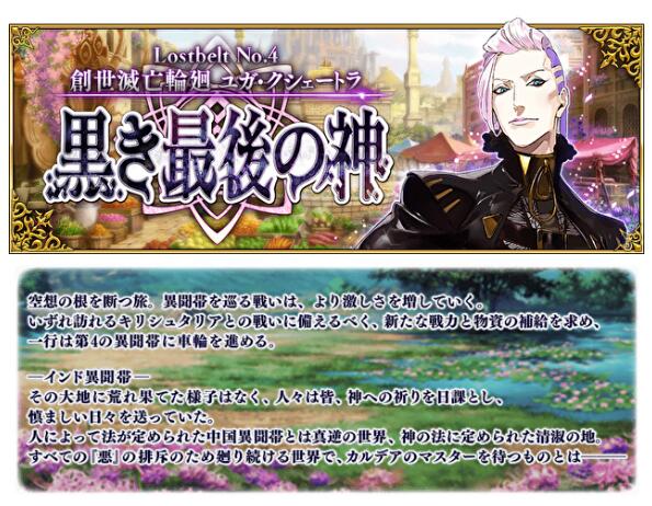 「创世灭亡轮回 Yuga Kshetra 最后的黑色神明」的舞台在印度。在这被鲜艳的莲花所包覆的世界中,将展开这次的物语。此外,得先将第二部第三章「Lostbelt No.3 人智统合真国 秦 红之月下美人」通关后,才会开放这次的章节。