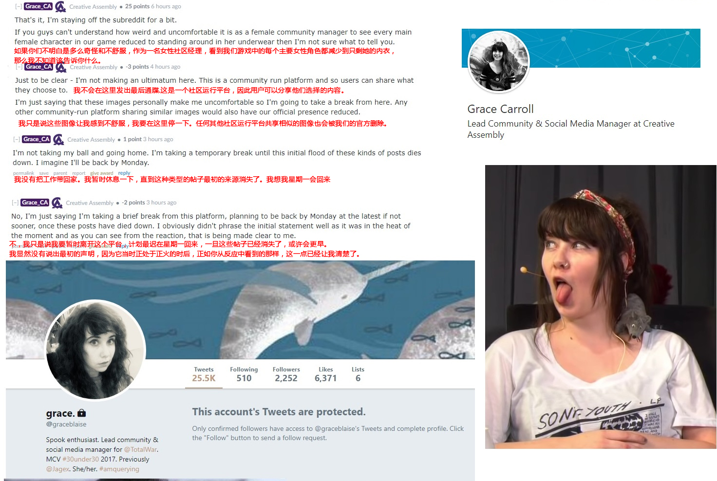 对于暴露立绘,Grace在Reddit上回复说:“如果你们不明白作为一名女性社区经理看到我们游戏中的每个主要女性角色都少到只剩下内衣是多么的不舒服和无奈,那么我不知道该告诉你什么。我没有把工作带回家,我暂时休息一下,直到这种类型的帖子最初的来源消失了。”