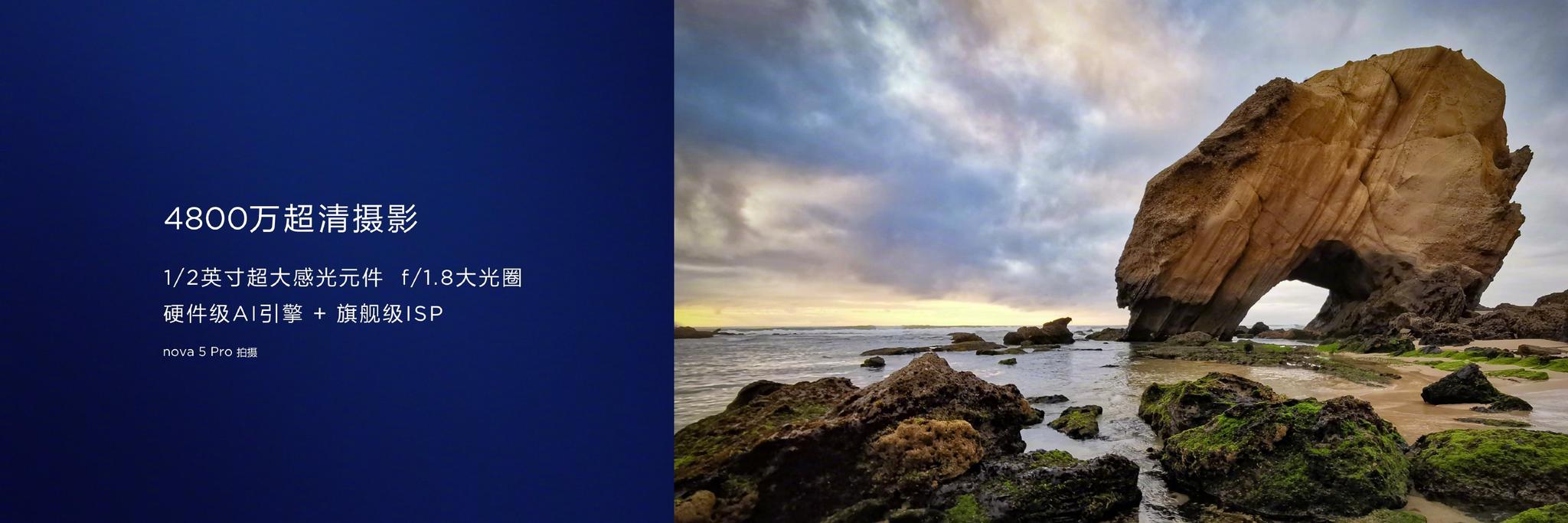 顶配版本nova 5 Pro搭载了准旗舰级的4800万像素后置AI四摄。nova 5 Pro的后置四摄采用了左上角垂直布局,最顶部是1600万像素的超广角镜头,然后是4800万像素高清主镜头,1/2英寸超大感光元件,F1.8大光圈,等效焦距26mm,搭配硬件级AI引擎、旗舰级ISP,接下来是200万像素景深镜头和闪光灯,另有一颗200万像素微距镜头独立在外。