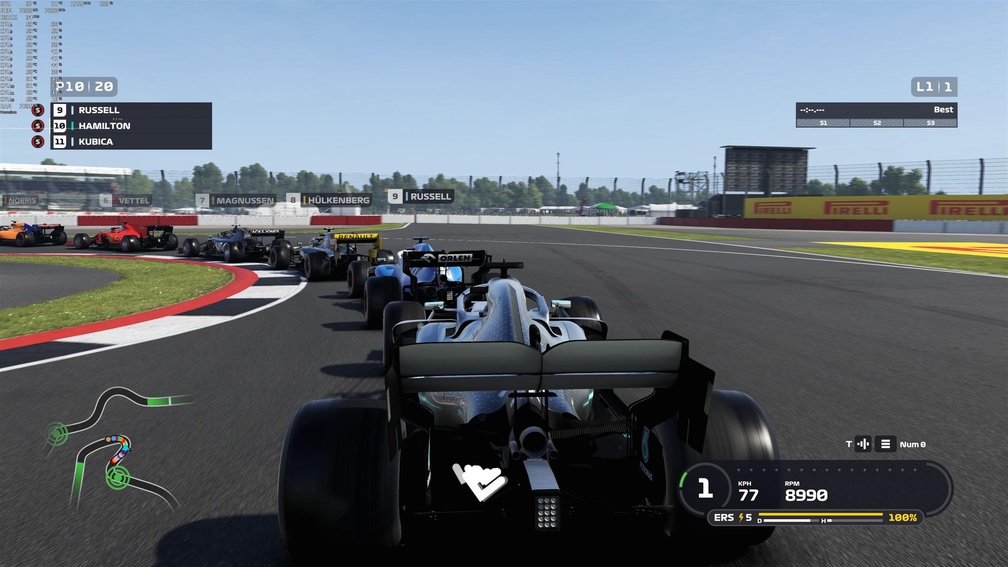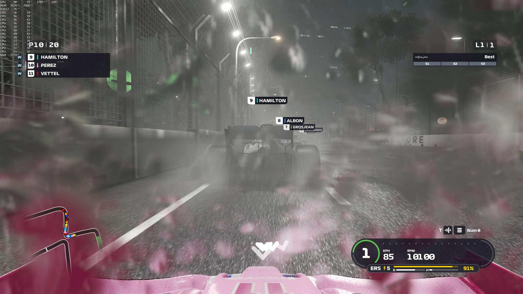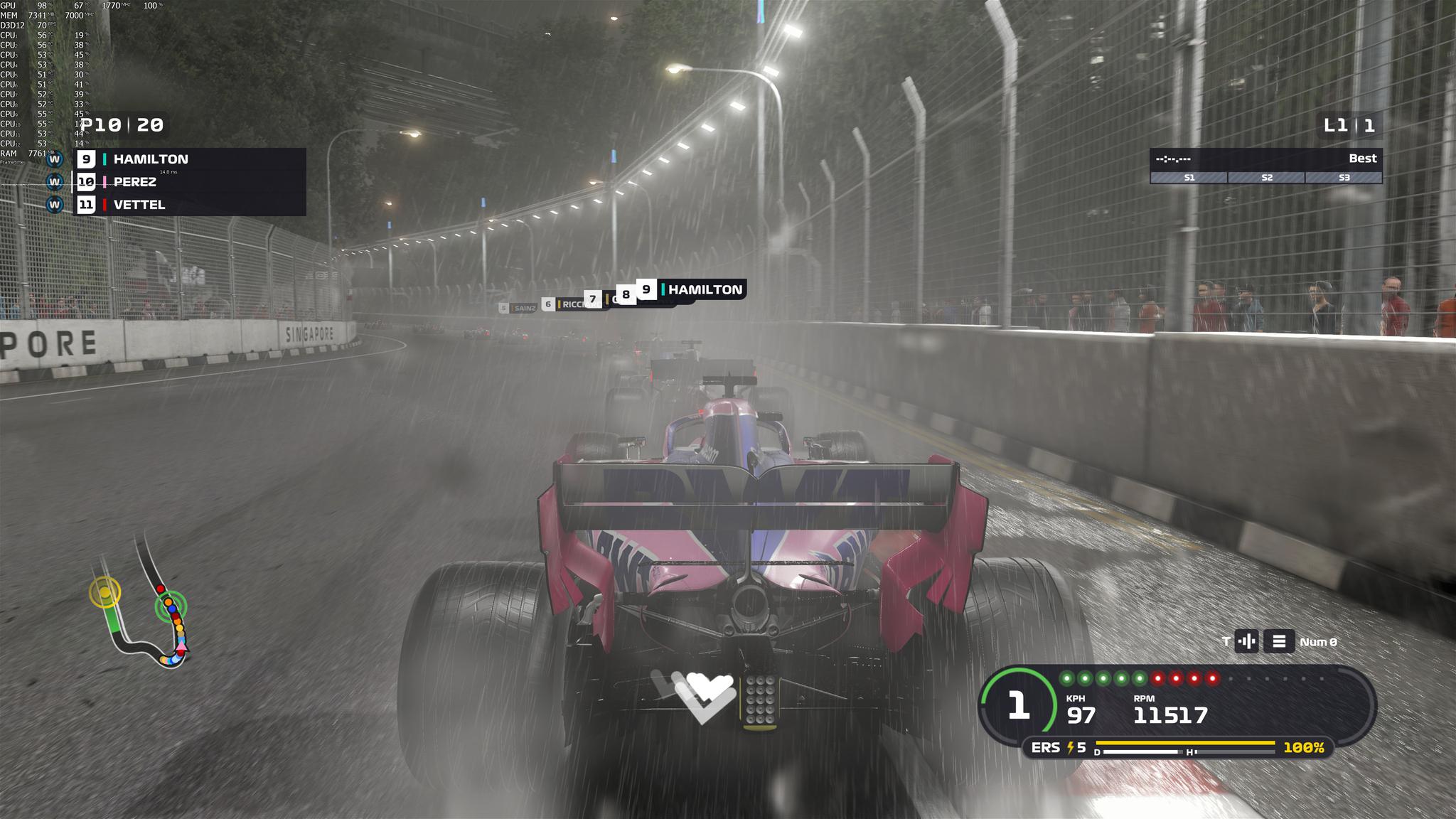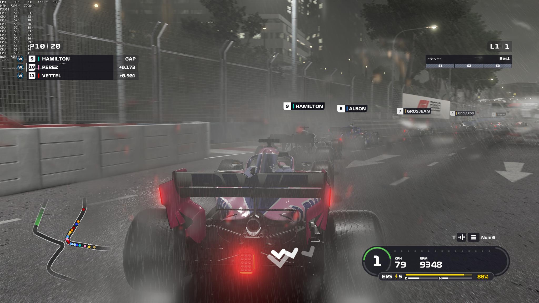 F1 2019支持DirectX 12,NVIDIA GeForce RTX2080Ti能够在4K分辨率最高画质设定下提供稳定的60fps,即便是在画面最复杂的情况下(夜间大雨)。